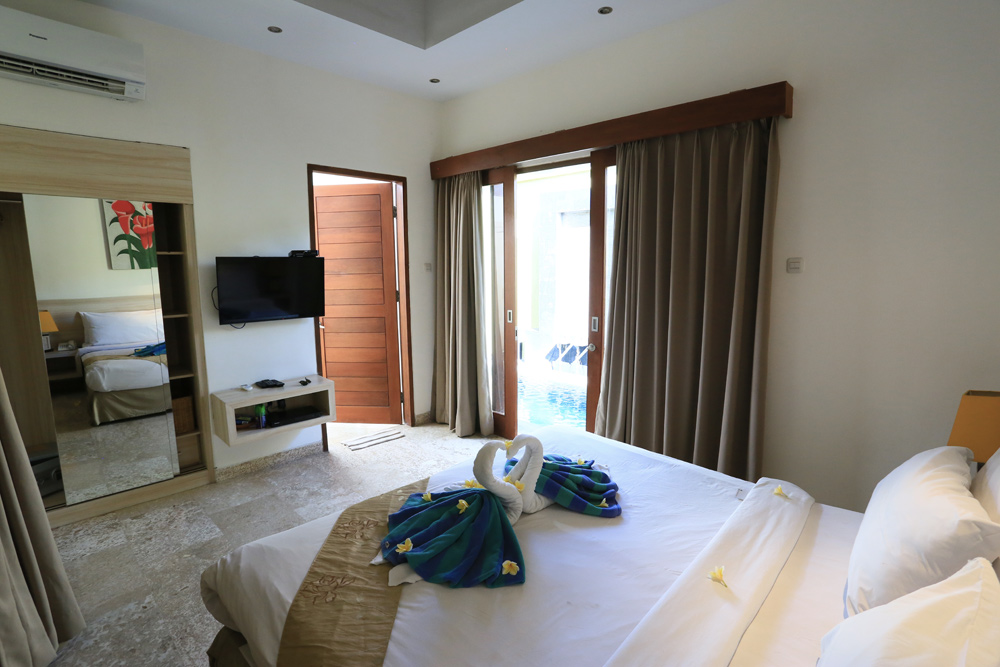 Nos 24 dernières heures dans le petit paradis indonésien ont comme des airs de vacances, qui contrastent avec nos habitudes de voyage. Nous nous sommes laissés tenter par la location d’une petite villa avec piscine privative, à Seminyak, dans l’hôtel The Jas Villas, grâce à une promotion sur Booking. la ville balnéaire principale de l’île, située à moins de 15 kilomètres de l’aéroport. Les 80 mètres carrés très cosy de notre espace pour les vingt quatre prochaines heures sont certainement les plus luxueux que nous ayons eu depuis que nous voyageons.
