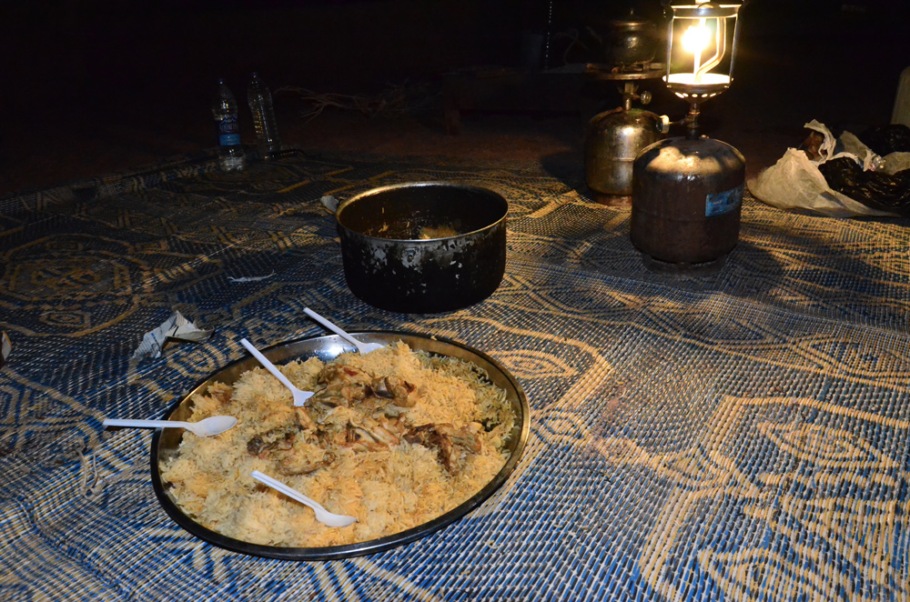 La nuit tombe assez tôt, nous sommes dans l’obscurité dès 18h30. Le repas composé d’une salade de légumes ainsi que du poulet et environ 3 kg de riz (!) nous est servi dans l’intimité d’une lampe à gaz et d’un feu de camp qui prépare les braises pour allumer la narguilé d’après-repas. Lui ayant dit que nous fumions le narguilé, il a gentiment ramené le sien de chez lui. La soirée est l’occasion pour Abdullah de parler de lui, de sa vie, de la culture bédouine et de la Jordanie en général. Un riche moment d’échange dans un cadre intimiste malgré l’immensité qui nous entoure.